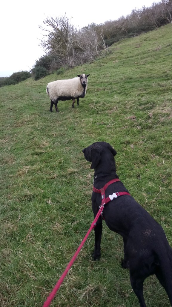 Extracts of the recordings include a louder, more urgent sounding voice, swiftly getting Nomar on the lead as we were passed on the cliffs by a running herd of sheep, and contrasting with my enthralled teenage sounding voice, with dropped consonants, as I recount the ‘lady farmer…bezzin’ past…on a quad bike’ and her three sheep-dogs running close to the ground alongside. I have a rousing curiosity about powerful women… and the sheep are Badger-Face Welsh Mountain Sheep, which have long been favourites of mine. They are striking and confident and seem very relaxed around dogs, Nomar came almost nose to nose with one.