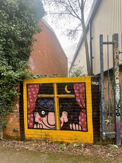 I digress. The ‘utopian’ part of my childhood, I suppose, was to do with having a lot of freedom to roam around the farm; spend time with animals, make dens in the woods, hack through undergrowth like it was a jungle, walk the perimeter of a field at sunset while the lambs performed their early evening races. Let my mind wander with my feet. This is what I try to recreate, when I get the chance. My dog keeps me company while I get lost in… or come back to? …my thoughts and sensations. Quite a different environment to the farm on the fringes of a small hamlet. I often wander along the river, and worry as I notice the subsidence beneath the new tower blocks, which are under construction on the river bank. Then I am pleasantly surprised at the street art, which has had an upgrade compared to five or so years ago – top of the list is the cheeky ‘Burglar Bill’ (one of my son’s favourite stories). I eventually wind my way back through Arnos Vale cemetery of course… sometimes with sadness, other times with curiosity, less and less with rage and once in a while, with playfulness.