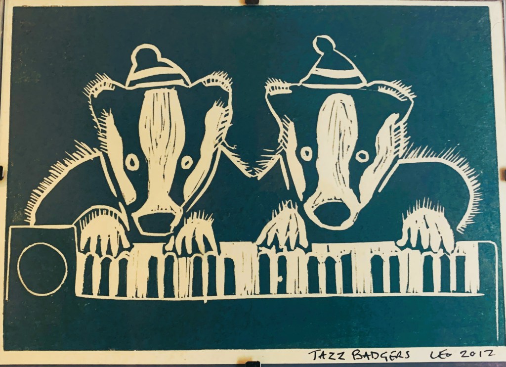 This year I discovered that in Al-Anon (3), one of the popular mantras is, ‘Look, but don’t stare’. This, I understand, relates to ones own distressing past experiences. Or, I suppose, those that other people are telling you about from their own pasts. I have a very visual mind (and a very vivid imagination): When somebody tells me something they have experienced, if I don’t catch myself, I immediately imagine it. I would like to extend the Al-Anon mantra to; ‘witness, don’t imagine’. Sometimes empathy can go too far, and be misguided. The jazz badgers (below) remind me to be alongside people without disappearing into their traumas, or my imagined versions of them.